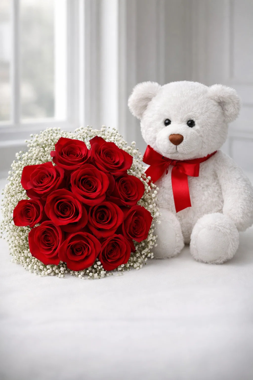 Packages for a one-dozen red rose bouquet with a 10-12 inch white teddy bear are available from various online florists, often bundled with additional items like chocolates or a vase.